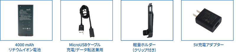 *標準構成品: 本体、バッテリー、ACアダプタ、USBケーブル(充電/データ転送兼⽤)、軽量ホルダー(クリップ付き)、ストラップ